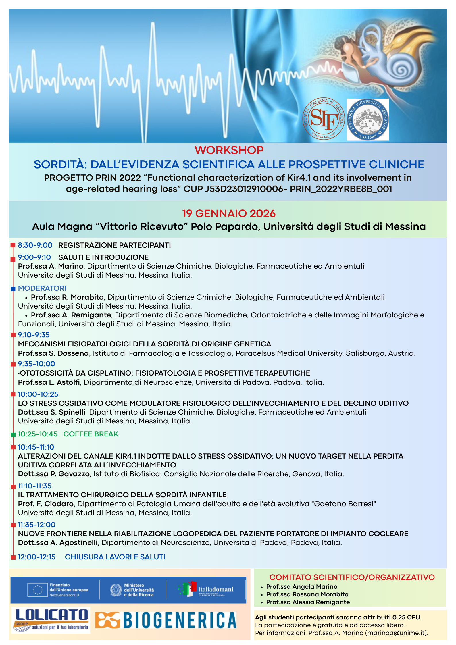 Nell'ambito del Progetto PRIN 2022 "Functional characterization of Kir4.1 and its involvement in the age-related hearing loss", il giorno 19 gennaio 2026 si terrà un Workshop dal tiolo "Sordità: dall’evidenza scientifica alle prospettive cliniche", sotto il patrocinio dell'Università di Messina e della Società Italiana di Fisiologia, con esperti e divulgatori provenienti da varie parti d'Italia e dall'estero. Il workshop vede nel comitato organizzatore e come moderatrice anche la Prof.ssa A. Remigante del nostro Dipartimento.