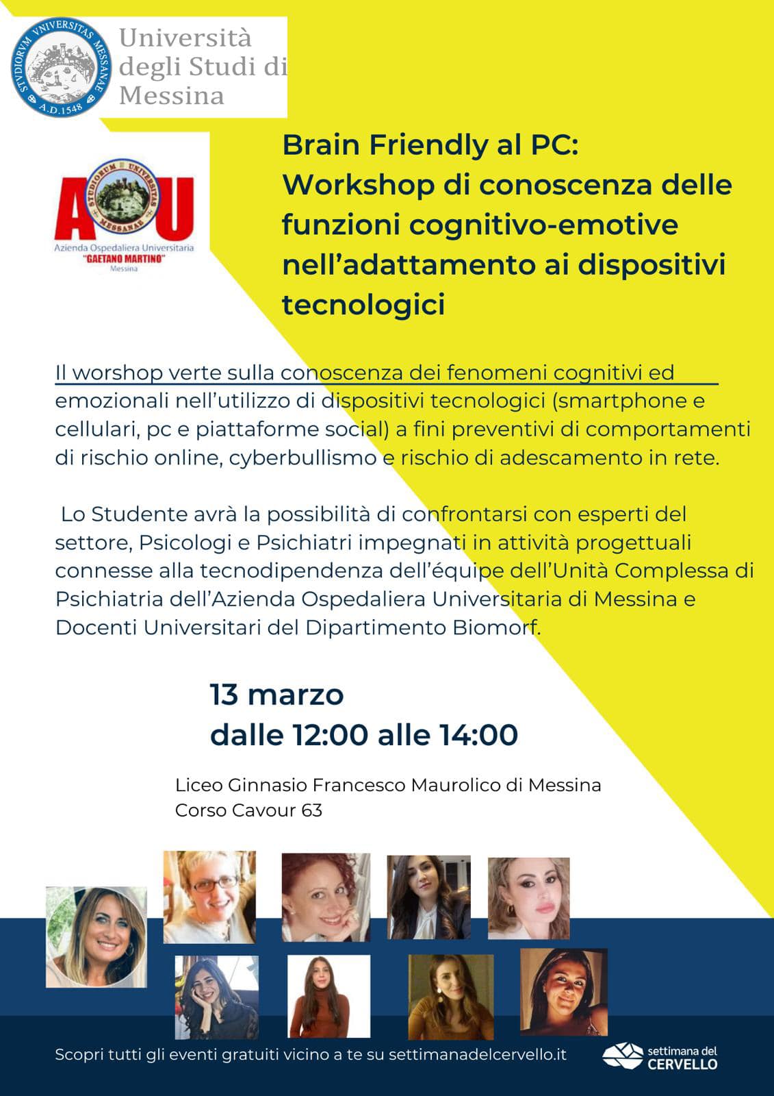 Quale iniziativa di tutela della salute e informazione e prevenzione delle dipendenze tecnologiche, si terrà il 13 marzo 2025 un Workshop di conoscenza della funzioni cognitivo-emotive nell'adattamento ai dispositivi tecnologici, tenuto presso il Liceo Ginnasio Maurolico di Messina dalle Prof.sse M. R. A. Muscatello e C. Mento del Dipartimento Biomorf di UniMe.